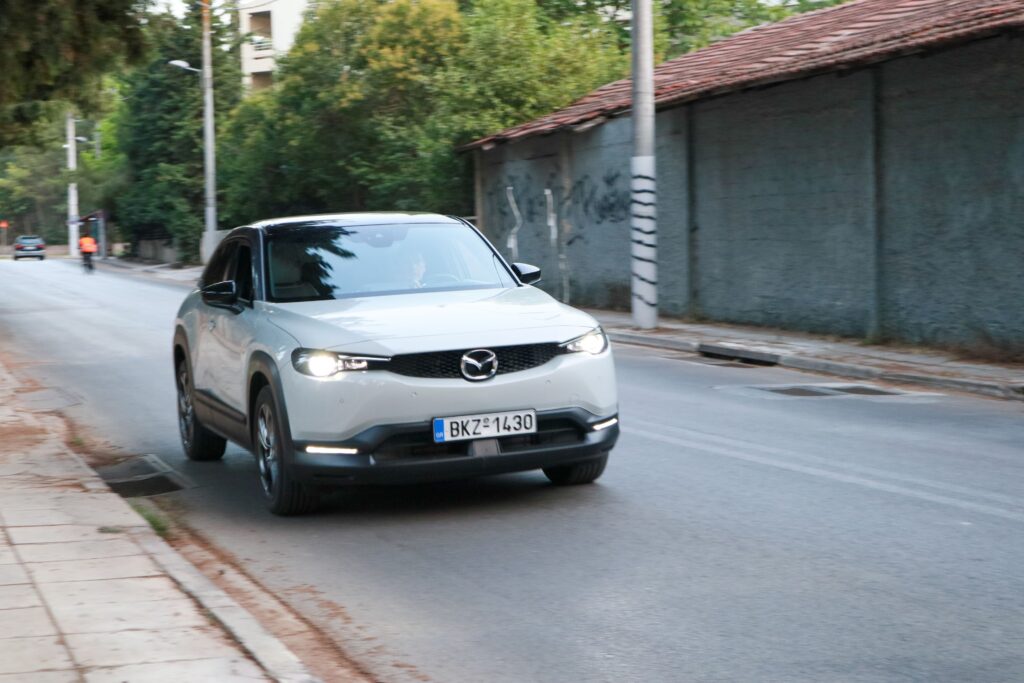 Η ροπή φυσικά είναι άμεση και με το παραμικρό πάτημα του γκαζιού θα κολλήσεις στο κάθισμα ακόμα και αν οι αριθμοί δεν προδιαθέτουν για κάτι τέτοιο. Τα 0-100 πάντως έρχονται σε 9,7″ και η τελική ταχύτητα περιορίζεται στα 140 χλμ./ώρα νούμερα ικανοποιητικά για ηλεκτρικό αυτοκίνητο με βάρος που αγγίζει τα 1.645 κιλά. Παρά τα κιλά του πάντως θα ακινητοποιηθεί χωρίς κανένα πρόβλημα με τα δυνατά φρένα και τους δίσκους εμπρός-πίσω (!) να μεταφέρουν σωστή αίσθηση στον οδηγό από το μεσαίο πεντάλ. Κατά την επιτάχυνση ένας ενδιαφέρον ήχος από το Mazda Sound Concept θα βοηθήσει στην κατανόηση την επιτάχυνσης αλλά δεν απενεργοποιείται για όσους θα ήθελαν την απόλυτη ησυχία και σε αυτή την φάση. Η ηχομόνωση είναι σίγουρα ένα από τα θετικά και η ορατότητα ικανοποιητική. Υπάρχει μια πληθώρα συστημάτων υποβοήθησης και ασφάλειας του οδηγού από τη σουίτα i–Activsense για το 5άστερο στο Euro NCAP MX-30 και εγγύηση 8 ετών ή 160.000 χιλιομέτρων για την μπαταρία.