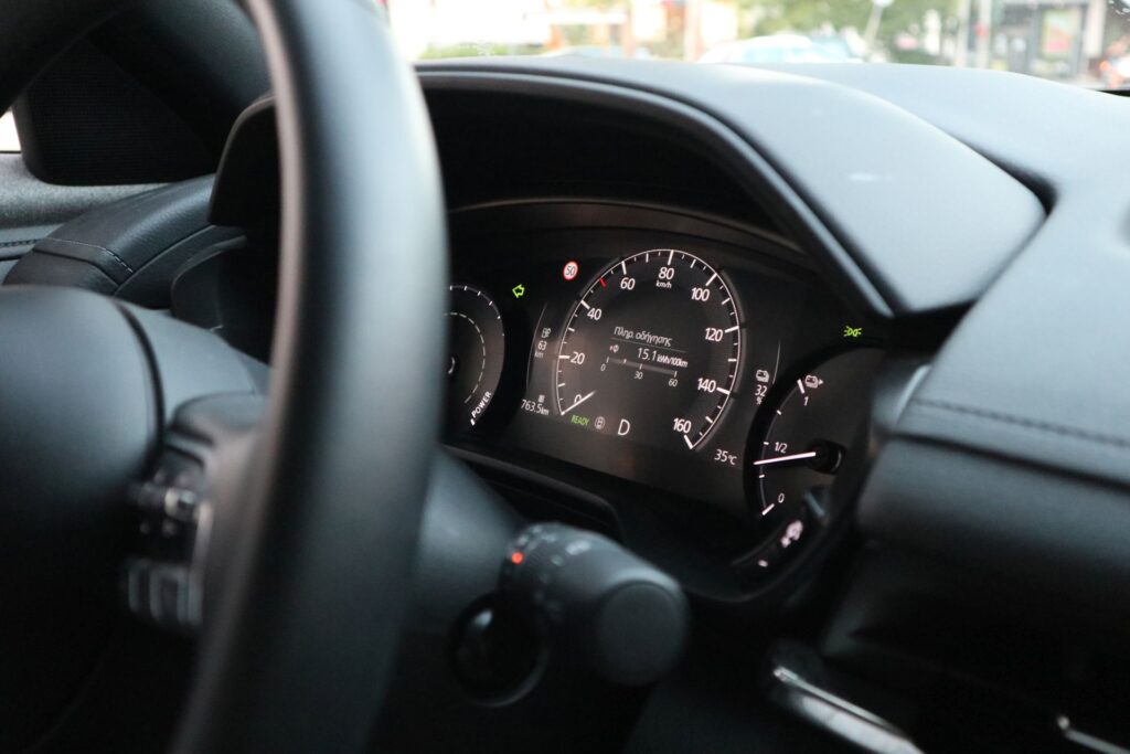 Η μπαταρία που τροφοδοτεί τον ηλεκτροκινητήρα είναι μόλις 35,5 kW και αντικειμενικά για το μέγεθος του MX-30 είναι μικρή, με την αυτονομία να μην ξεπερνάει τα 200 χιλιόμετρα στο κύκλο WLTP, αλλά παραδόξως να αγγίζει τα νούμερα του κατασκευαστή και στις πραγματικές συνθήκες της δοκιμής μας. Το Trip Computer έγραφε 184 χιλιόμετρα αυτονομίας μετά από πλήρη φόρτιση και καταφέραμε να το ξεπεράσουμε πριν από τη πρώτη δική μας φόρτιση. Καταφέραμε επίσης να διατηρήσουμε τη κατανάλωση στον αστικό κύκλο κάτω από τις 19 kWh/100 χλμ. της εργοστασιακής ενώ σε μεγάλη κίνηση στο κέντρο της πόλης καταφέραμε να τη περιορίσουμε ακόμα και στις 15. Αυτό επιτυγχάνεται με συντηρητική οδήγηση αλλά δείχνει ότι τα ηλεκτρονικά συστήματα διαχείρισης ενέργειας της Mazda λειτουργούν άψογα. Μεγάλο ρόλο σε αυτό παίζει και η ανάκτηση ενέργειας, η οποία ρυθμίζεται από τα Paddles στο τιμόνι σε 5 στάδια. Το μεσαίο στάδιο είναι ισορροπημένο και τα υπόλοιπα 4 επιτρέπουν είτε το ελεύθερο ρολλάρισμα ή τη μέγιστη αναγεννητική πέδηση που επιβραδύνει αρκετά το αυτοκίνητο, όχι όμως μέχρι την ακινητοποίηση. Θα μπορούσαμε να το δούμε και σαν ένα άτυπο τρόπο να ρυθμίσουμε το στυλ της οδήγησης που μας ταιριάζει. Σε γρήγορο ρυθμό το ελεύθερο ρολλάρισμα βοηθάει την έντονη επιτάχυνση και το δυνατό φρενάρισμα ενώ η μέγιστη αναγεννητική πέδηση την ευκολία οδήγησης στη πόλη και τη μεγιστοποίηση της αυτονομίας.