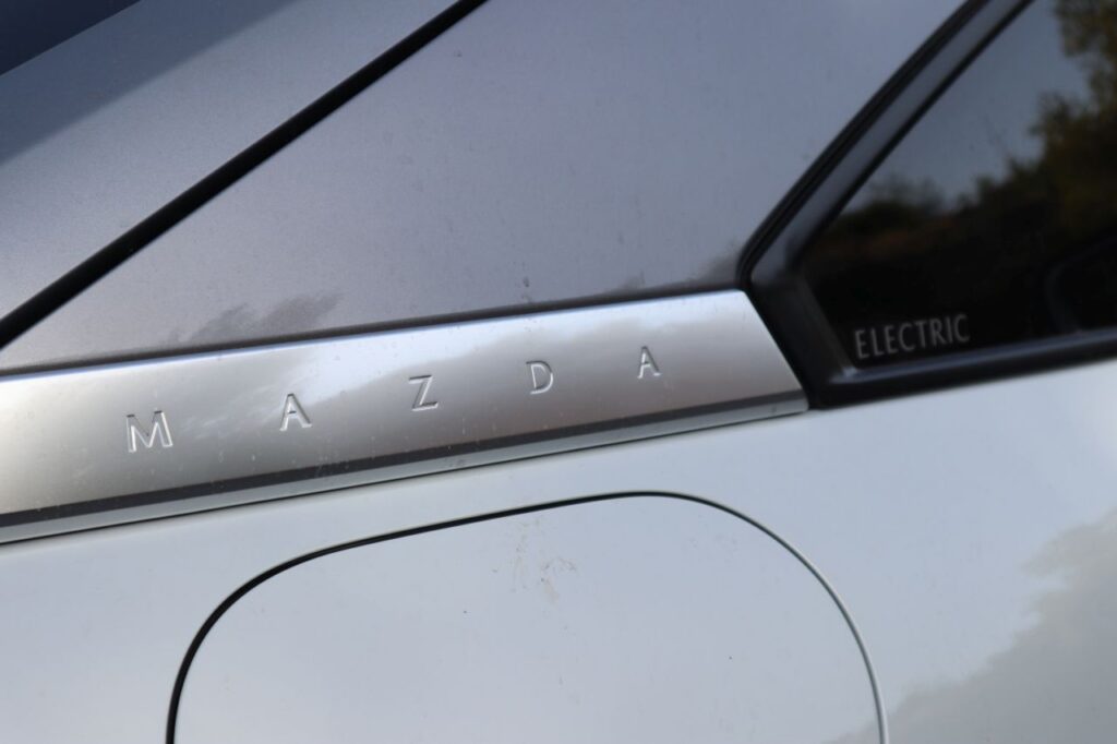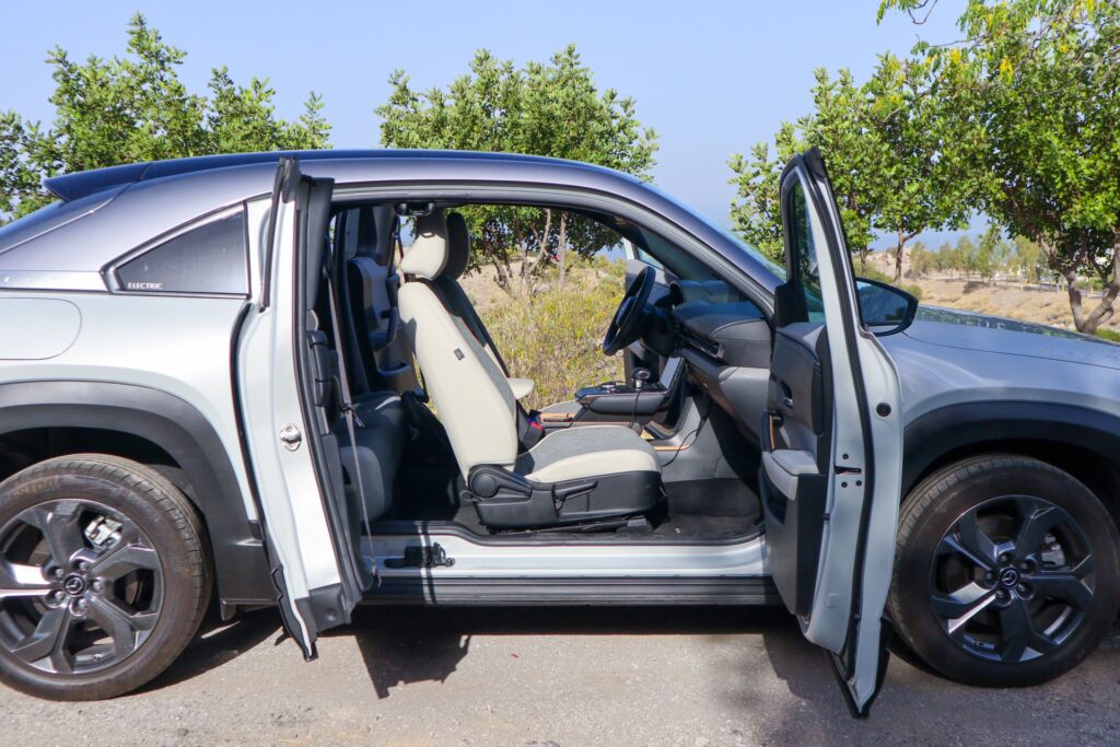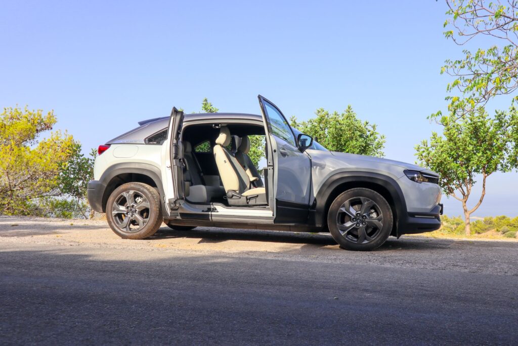 Με μήκος 4,4 μέτρα και πλάτος 1,8 έρχεται αντιμέτωπο με τα Kia e-Niro και VW ID.3, δεν θα το περιέγραφες ως ένα αυτοκίνητο πόλης, χωρίς αυτό να σημαίνει ότι δεν είναι σχετικά Compact και μπορείς να κινηθείς με άνεση στο αστικό περιβάλλον. Η σχεδίασή του παίζει σίγουρα σημαντικό ρόλο σε αυτό και πέρα από το “Wow Factor” με την τρισδιάστατη μάσκα, τα επιθετικά μπροστινά φώτα που θυμίζουν “Γεράκι”, τα πίσω φώτα που θυμίζουν κάποια γνωστά κόκκινα Supercar και τα προστατευτικά σε όλο το αμάξωμα, το MX-30 έχει μια ιδιαίτερα μεγάλη κλίση στο πίσω μέρος και για το λόγο αυτό δείχνει μικρότερο απ’ ότι είναι. Σημείο αναφοράς πάντως είναι οι πίσω πόρτες, οι οποίες μας “ταξίδεψαν” χρόνια πίσω, στο 2003 με το εμβληματικό RX-8, καθώς είναι “Free Style” και ανοίγουν αντικριστά. Οι χρωματικές επιλογές είναι συγκεκριμένες και συνδυάζονται με διχρωμία στην οροφή, μια χρωμιωμένη επιφάνεια στη πίσω κολώνα με το ανάγλυφο λογότυπο της εταιρείας και ένα σχέδιο για τις γκρι ζάντες αλουμινίου 18″.
