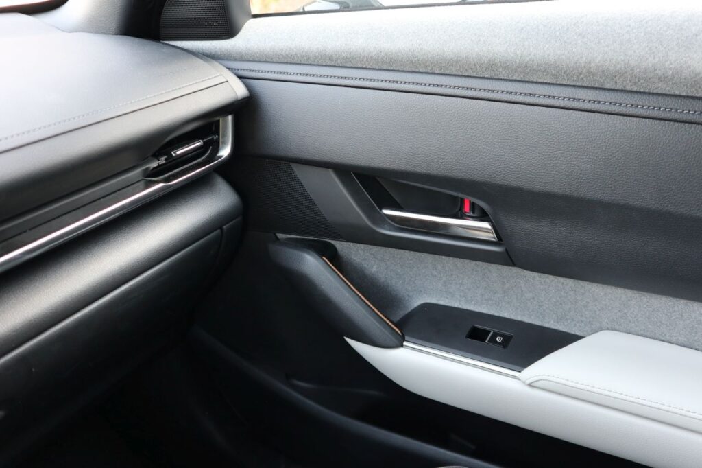 Η διαφοροποίηση από τα μη ηλεκτρικά μοντέλα γίνεται με τη προσθήκη μιας τοποθετημένης υπό γωνία τρίτης οθόνης αφής 7,7 ιντσών, αποκλειστικά για τον χειρισμό του κλιματισμού. Αυτό το έχουμε συναντήσει μόνο σε πολύ ακριβά αυτοκίνητα στο παρελθόν και πέρα από το Hi-tech του πράγματος η Mazda έχει φροντίσει να μη χαθεί η εργονομία με τη προσθήκη φυσικών κουμπιών εκατέρωθεν. Η εργονομία είναι γενικότερα σε υψηλό επίπεδο όπως και η ποιότητα όπου σε αντίθεση με τα περισσότερα αμιγώς ηλεκτρικά μοντέλα του ανταγωνισμού, η καμπίνα του MX-30 αποτελείται από ποιοτικά, μαλακά υλικά. Δεν είναι όμως τα μαλακά “πλαστικά” που εντυπωσιάζουν αλλά το γεγονός ότι πολλά από αυτά είναι φιλικά προς το περιβάλλον. Οι πόρτες είναι ντυμένες με ένα υλικό που προέρχεται από ανακυκλωμένα καπάκια πλαστικών μπουκαλιών με υφή “τσόχας”, τα δέρματα είναι “Vegan” και τόσο η κεντρική κονσόλα όσο και οι χειρολαβές έχουν επένδυση από φελλό που προέρχεται και αυτός από ανακυκλωμένα πώματα μπουκαλιών, ένα υλικό που αποτίει φόρο τιμής στην ίδρυση της εταιρείας. H Mazda ξεκίνησε ως εταιρεία παραγωγής φελλού το 1920 στην Χιροσίμα με την ονομασία Toyo Cork Kogyo Corporation. Αναμενόμενα, πολύ καλή είναι και η συναρμογή όπως και η ηχομόνωση, “υποχρεωτικά” και τα δύο για ένα αυτοκίνητο που πέρα από μηδενικές εκπομπές ρύπων έχει μηδενικούς μηχανικούς θορύβους.
