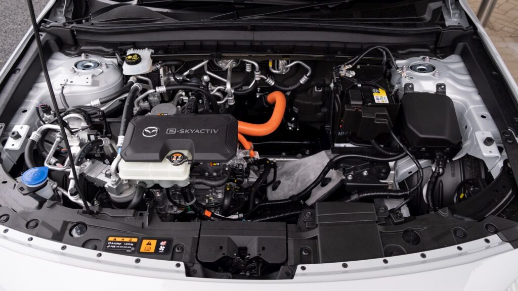 Στην αρχή αναφέραμε ότι το ΜΧ-30 δεν εξελίχθηκε αποκλειστικά ως ηλεκτρικό και αυτό έχει σαν αποτέλεσμα το καπό να έχει περισσότερο χώρο από αυτόν που απαιτεί ο ηλεκτροκινητήρας. Αυτός ακούει στο όνομα e-skyactiv που είναι γνώριμο από τους ατμοσφαιρικούς δίλιτρους και ήπια υβριδικούς κινητήρες των Mazda 3 και CX30. Εδώ όμως πρόκειται για έναν σύγχρονο ηλεκτροκινητήρα μόνιμου μαγνήτη με απόδοση 105 kW, περίπου 143 ίππους δηλαδή και 265 Nm ροπής. Τα τεχνικά χαρακτηριστικά σίγουρα δεν προκαλούν μεγάλο εντυπωσιασμό αφού έχουμε συνηθίσει τα ηλεκτρικά αυτοκίνητα να αποδίδουν χαλαρά 200 ίππους και τη ροπή να ξεπερνά τα 300 Nm, όμως σύμφωνα με τη Mazda, η απόδοση είναι σκόπιμα τόση όπως επίσης και η μπαταρία είναι σκόπιμα μικρή.