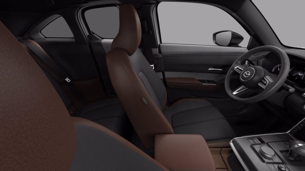Εκτός από τους υφιστάμενους χρωματικούς συνδυασμούς εσωτερικού Modern confidence (λευκό) και Industrial vintage (καφέ), το MX-30 2022 εισάγει τη νέα ολόμαυρη επένδυση Urban expression που φέρνει μια έντονη κομψότητα στη σχεδίαση. Το νέο, ολόμαυρο εσωτερικό αναζωογονείται από γκρι και λευκές πινελιές στην ταπετσαρία τζιν υφάσματος και από τη σκούρα καφέ του φελλού κονσόλα και την επένδυση της λαβής των θυρών.