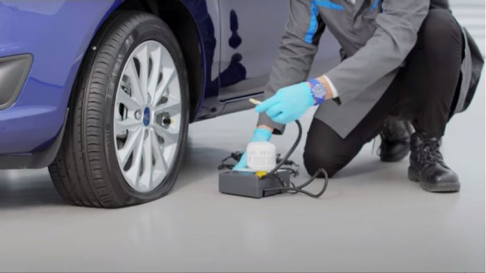 Στην περίπτωση που δεν υπάρχει ρεζέρβα αλλά μόνο κιτ επισκευής, τότε θα πρέπει να δώσουμε την απαραίτητη ηλεκτρική ενέργεια στην τρόμπα μέσω μιας παροχής στο αυτοκίνητο και να προσαρμόσουμε το μπουκαλάκι με το υγρό στη βαλβίδα.