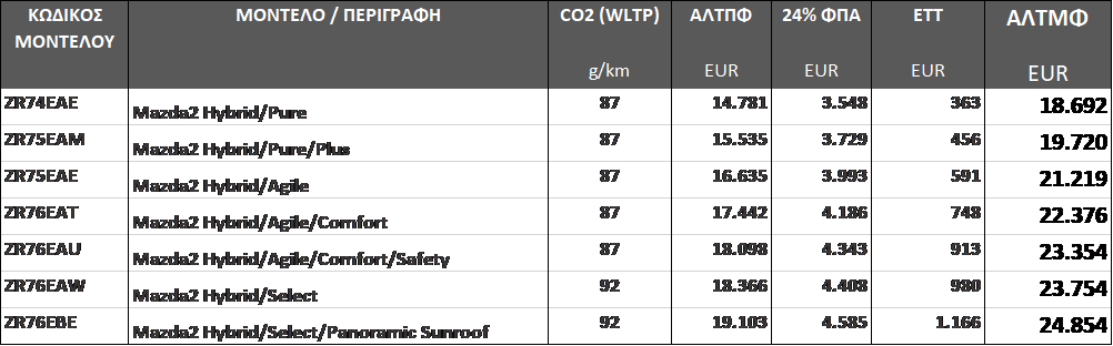 Το νέο Mazda2 Hybrid είναι ήδη διαθέσιμο για παραγγελίες στο δίκτυο Επισήμων Εμπόρων Mazda στις παρακάτω τιμές: