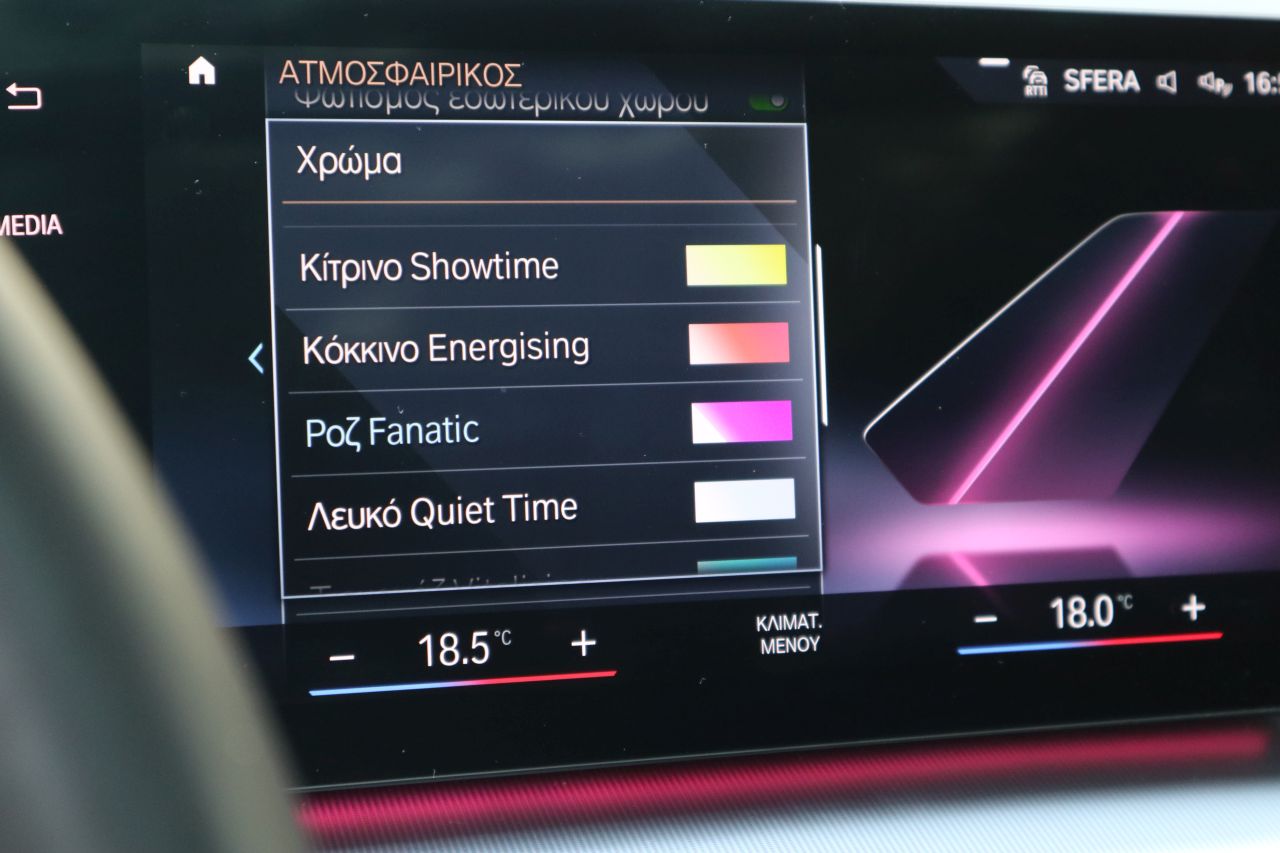 Η οθόνη 10,7″ εφοδιάζεται με το ολοκαίνουριο λογισμικό σύστημα 8 (Operating System 8) το οποίο έχει ένα User Interface που θυμίζει πολύ περισσότερο Smartphone από τη τελευταία έκδοση του iDrive 7. Οι πιο ψαγμένοι θα διακρίνουν ομοιότητες στα χρώματα, στα μενού και στη κεντρική οθόνη, όλα όμως είναι εκσυγχρονισμένα και πιο φωτεινά. Η κεντρική οθόνη έχει διαμορφώσιμα Live Widgets ενώ στην αριστερή μπάρα βρίσκονται τέσσερα πλέον κουμπιά συντομεύσεων για το τηλέφωνο, τα πολυμέσα, τη πλοήγηση και το “συρτάρι” των εφαρμογών αντίστοιχα. Με το πάτημα του τελευταίου εμφανίζονται σε ξεχωριστή οθόνη όλες οι εφαρμογές αλλά και οι συντομεύσεις διάφορων ρυθμίσεων. Διαθέτει επίσης πολύ γρήγορα στη σύνδεση ασύρματα Android Auto και Apple Car Play, δυνατότητα προσθήκης eSim με σύνδεση σε δίκτυα 5G, πολλαπλά προφίλ οδηγών και άμεση επικοινωνία με το BMW ID με την αντίστοιχη εφαρμογή για αποθήκευση ρυθμίσεων. Προαιρετικά προστίθεται και τεχνολογία AR, επαυξημένης πραγματικότητας δηλαδή, στο σύστημα πλοήγησης που με τη χρήση των καμερών του αυτοκινήτου εμφανίζει εν κινήσει βέλη για να βοηθήσει τον οδηγό να κινηθεί στη σωστή κατεύθυνση.