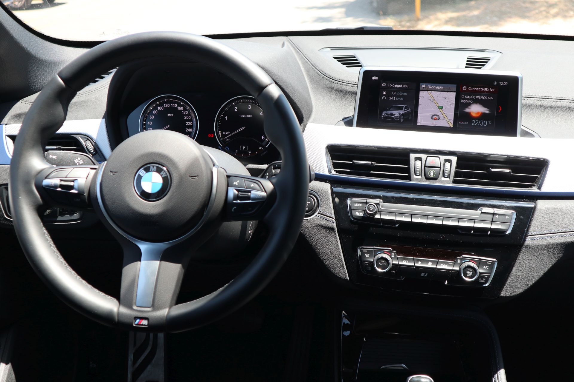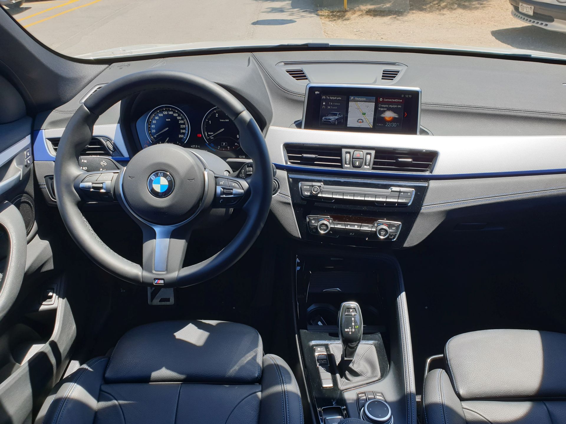 Στην έκδοση της δοκιμής υπάρχουν δερμάτινες επενδύσεις με ραφές και επένδυση αλουμινίου μαζί με μπλε ματ, λογότυπα M, M Sport μπάκετ καθίσματα και τιμόνι αλλά και η προαιρετική ευρεία οθόνη 8,8 ιντσών δίνουν στην X1 έναν ιδιαίτερο και σπορ χαρακτήρα που σε κάνουν να ξεχνάς ότι βρίσκεσαι σε ένα SUV με 116 ονομαστικούς ίππους.