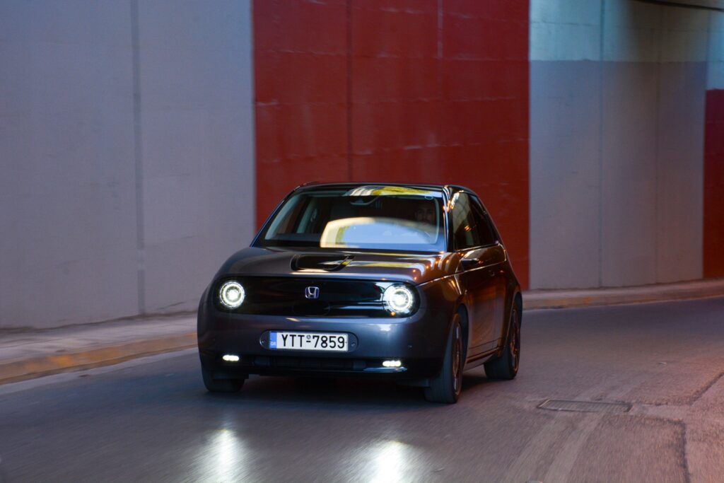 Το κέντρο βάρους είναι χαμηλά λόγω των μπαταριών ενώ τα 1.540 κιλά του μοιράζονται σε μια ιδανική κατανομή 50-50 και χάρη στη σφιχτή ανάρτηση και το στιβαρό πλαίσιο δεν γίνονται αισθητά. Το Honda e αλλάζει κατεύθυνση με ζωντάνια και το πίσω μέρος πλαισιώνεται φανταστικά ενώ ακόμα και εκτός ορίων αν το πιέσεις δεν θα απογοητεύσει με τις αντιδράσεις του. Στιγμιαία η ουρά μπορεί να ξεκολλήσει όμως το σύστημα ευστάθειας μαζεύει αμέσως το γλίστρημα και επαναφέρει το αυτοκίνητο στην σωστή τροχιά. Σε βρεγμένο οδόστρωμα είναι πιο εύκολο να ανοίξεις τη τροχιά του περισσότερο αλλά σε κάθε περίπτωση δεν επιτρέπει ένα πλήρες “Drift”. Είναι πάντως δυναμικό, ευχάριστο και σίγουρα παιχνιδιάρικο εάν το θελήσεις.