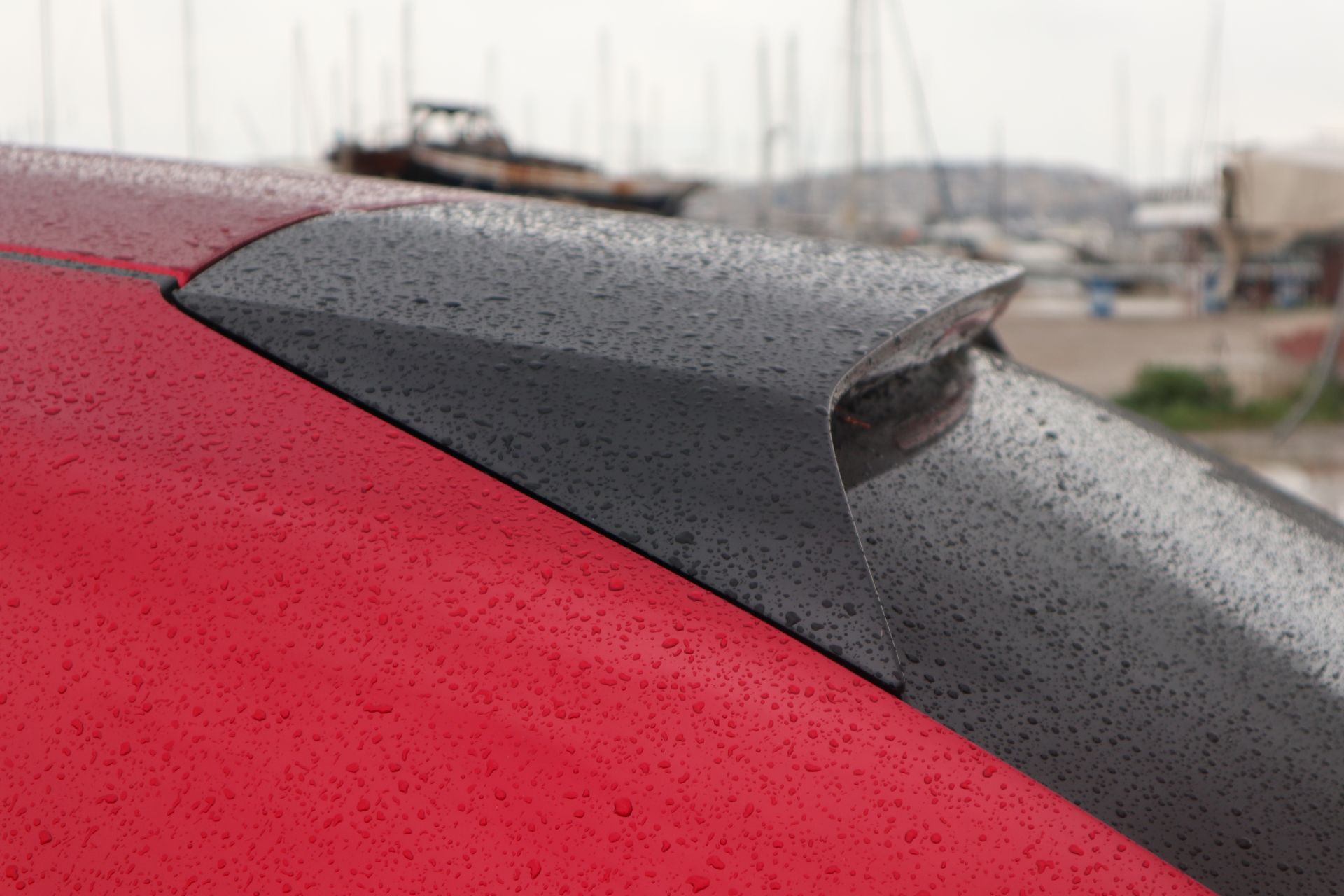Ο σχεδιασμός του έχει μια ροή και δεν υπάρχουν “κοφτερές” επιφάνειες αλλά ομοιόμορφα και “γλυκά” σχεδιασμένες καμπύλες με την έντονη πίσω κολόνα και την κεκλιμένη οροφή να καταλήγουν σε ένα τύπου κουπέ-hatchback πίσω μέρος. Μπροστά είναι επιθετικό με την τεράστια μάσκα, το μακρύ καπώ και τα λεπτά φωτιστικά σώματα με τους LED δακτυλίους στους προβολείς να λειτουργούν σαν “κόρη οφθαλμού ενός αγριεμένου βλέμματος”. Πίσω η σχεδίαση είναι πιο ήρεμη με τα επίσης λεπτά LED φώτα, την αεροτομή και τις διπλές απολήξεις της εξάτμισης. Δεν θα μπορούσαμε να μην κάνουμε αναφορά και στο εκπληκτικό αποκλειστικό χρώμα της Mazda, που στη προκειμένη περίπτωση συνδυάζεται με μαύρες λεπτομέρειες και αποτελεί στοιχείο αναγνωσιμότητας ακόμα και αν έχεις….πολλούς βαθμούς μυωπία.
