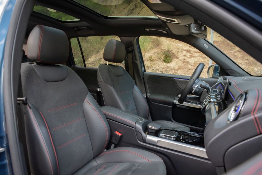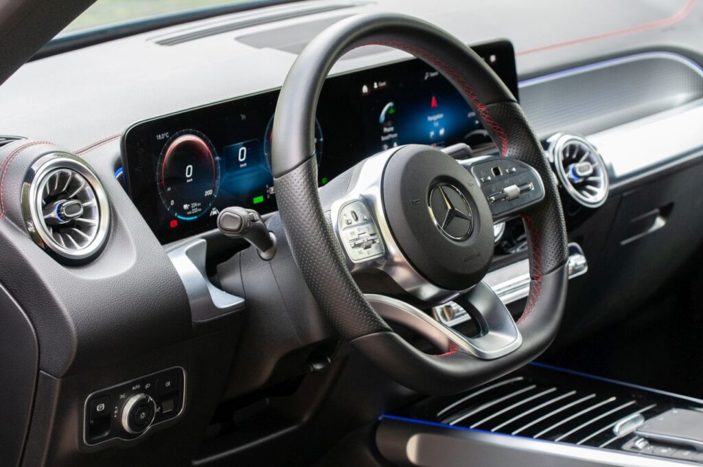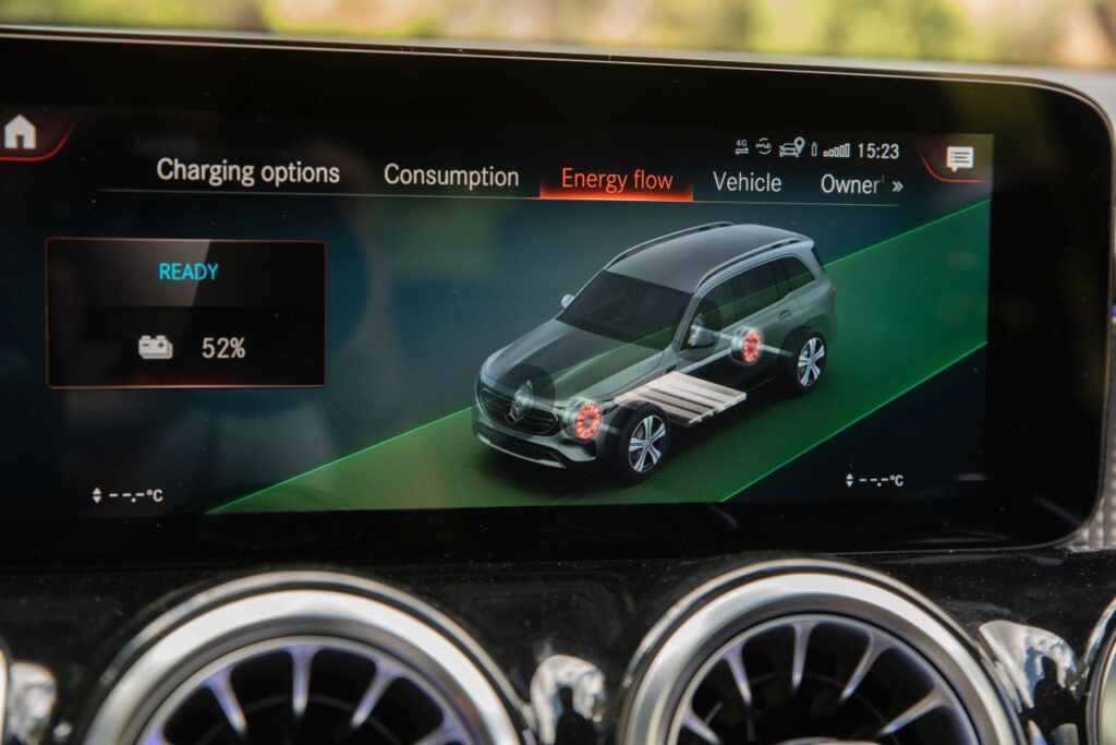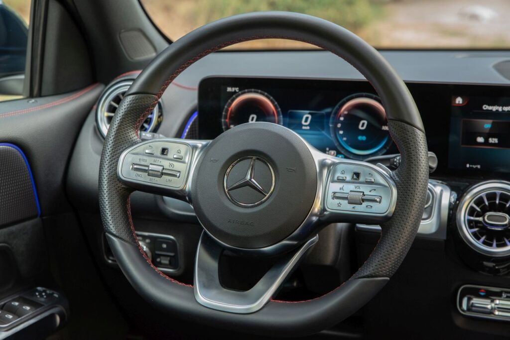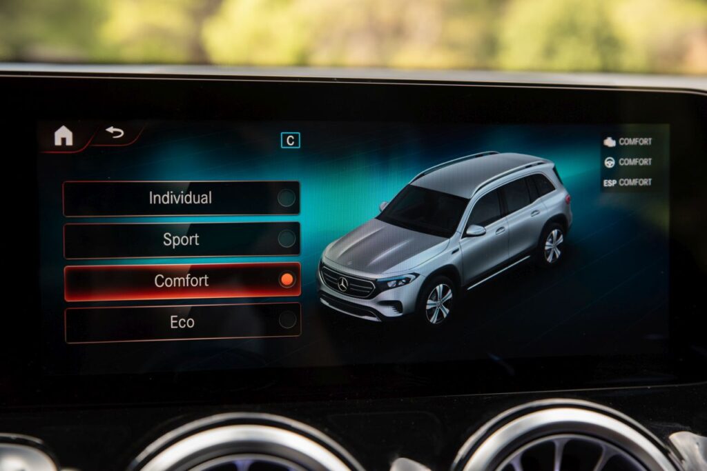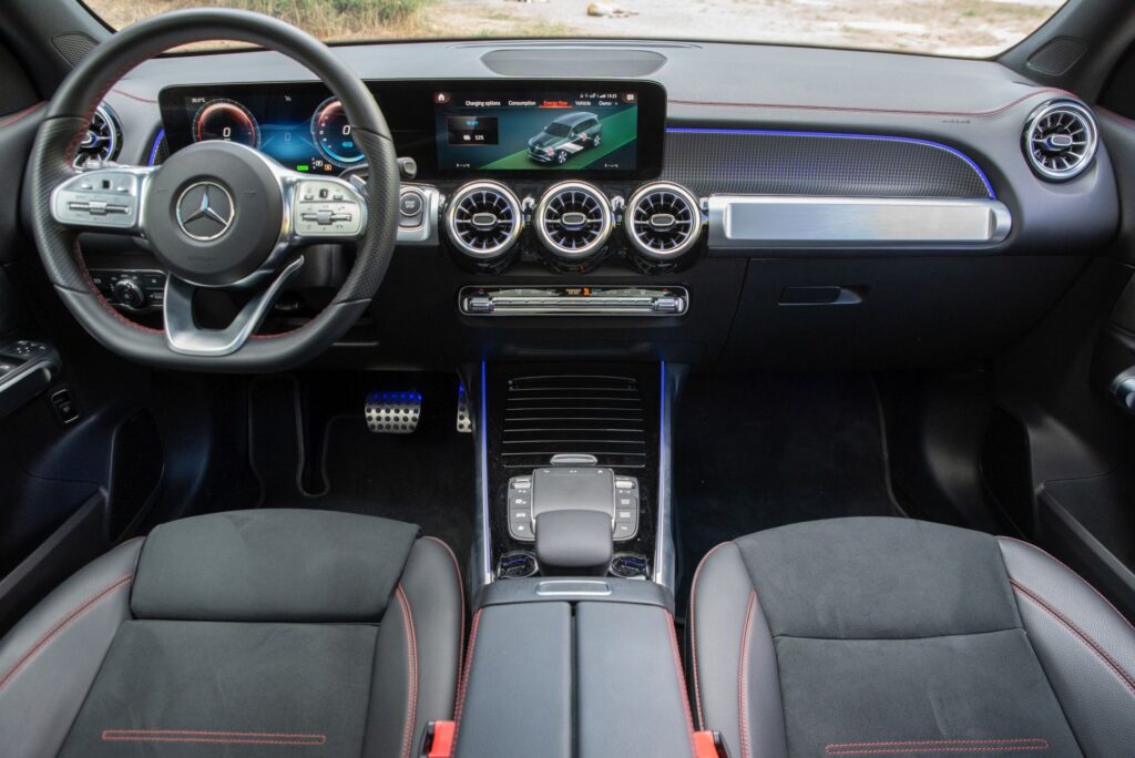Η καμπίνα είναι ολόιδια με αυτήν της GLB και οι διαφορές αφορούν στον πληρέστερο εξοπλισμό, στην προσθήκη ενός μοτίβου του ατμοσφαιρικού φωτισμού στο ταμπλό και στα ειδικά μενού EQ. Τα τελευταία ενσωματώνονται στο λογισμικό σύστημα MBUX, που είναι ένα εκ των κορυφαίων, και έχουν πληροφορίες για την μπαταρία, τη φόρτιση, την αυτονομία και τη χρήση ενέργειας. Η αυτονομία και η χρήση ενέργειας βέβαια υπάρχουν και στον ψηφιακό πίνακα οργάνων, ο οποίος πέρα από τα αντίστοιχα γραφικά έχει ένα επιπλέον “εξηλεκτρισμένο” θέμα. Τα θέματα επιλέγονται από τη κεντρική οθόνη και αλλάζουν τα γραφικά όργανα και τα χρώματα.
