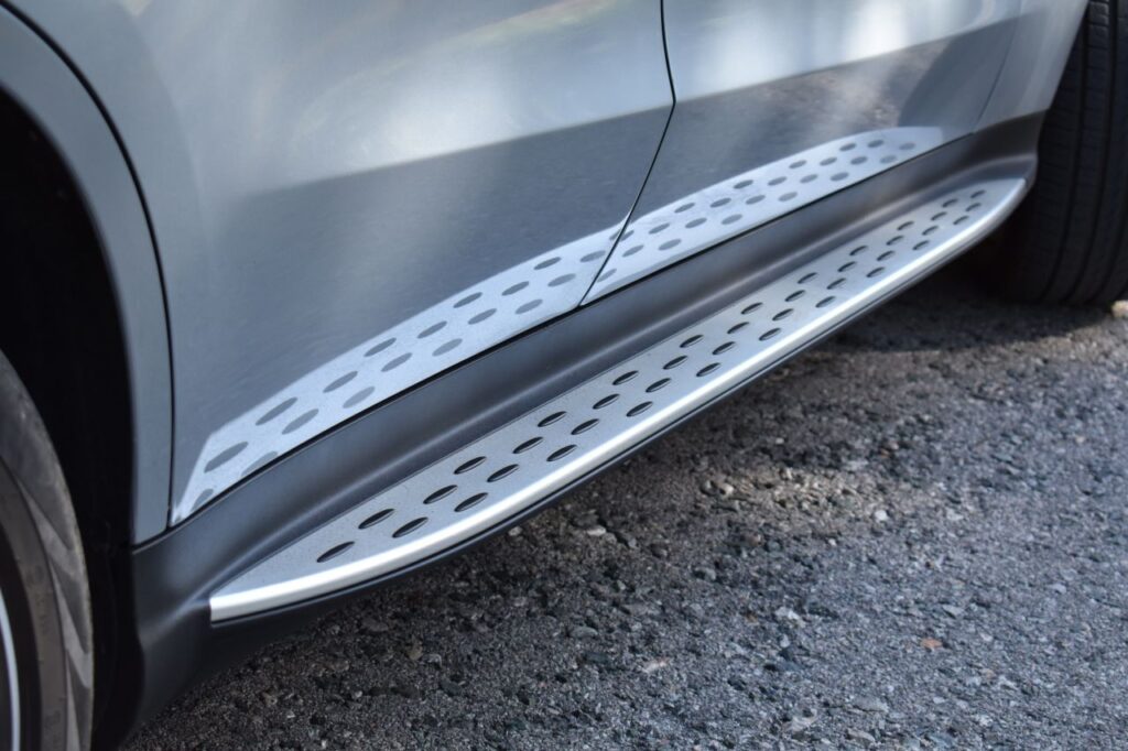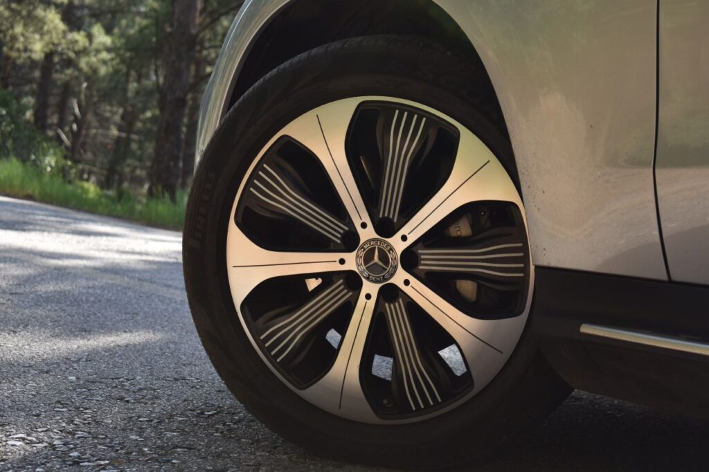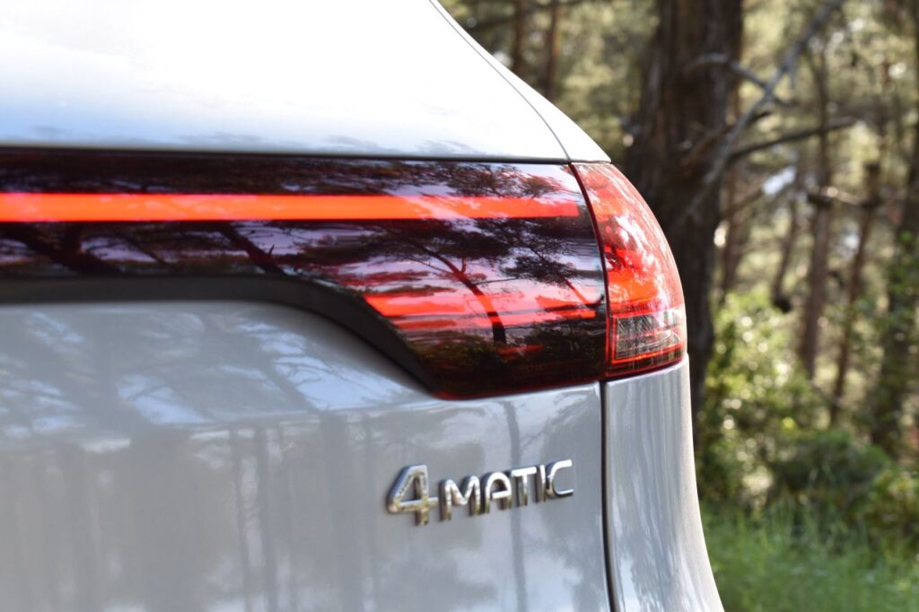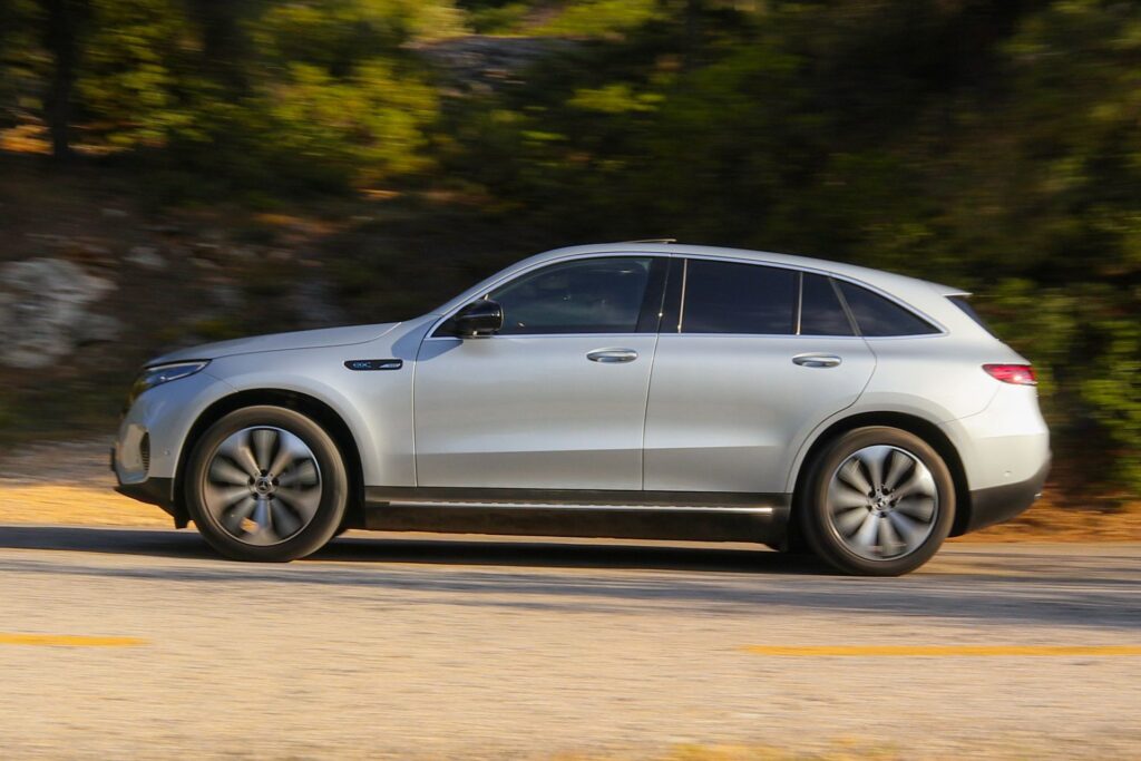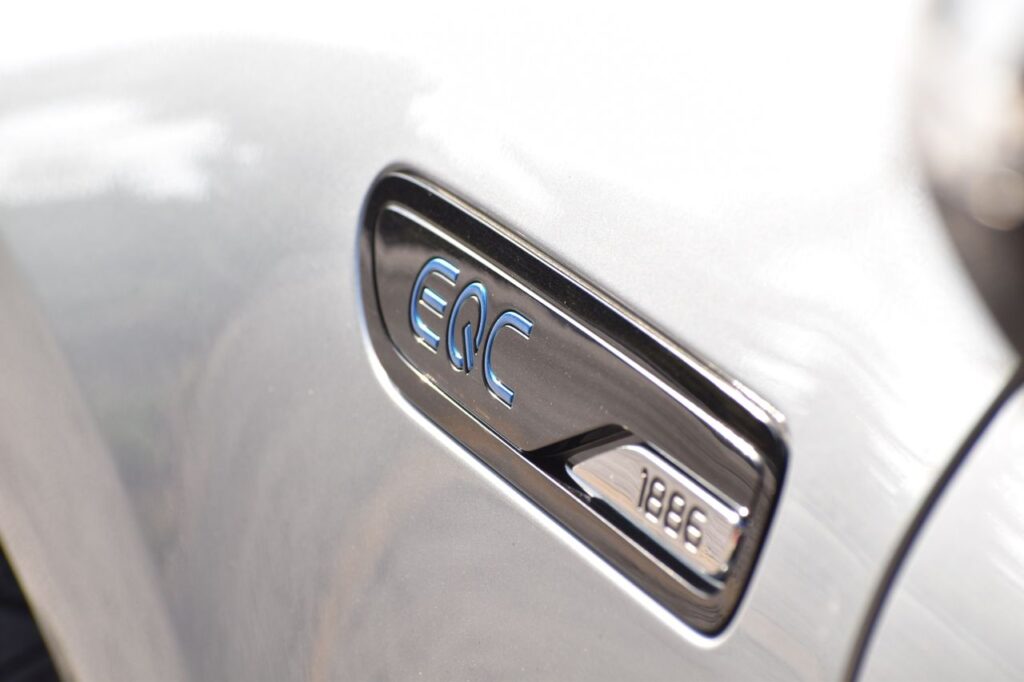 Από το προφίλ δείχνει τον όγκο της και την ομοιότητα της με τη GLC, στην οποία άλλωστε βασίζεται, έχει όμως μεγαλύτερη καμπυλότητα στην οροφή. Ένα διακοσμητικό μαύρο πάνελ με μπλε λογότυπο EQC κοσμεί το μπροστινό φτερό ενώ αναλόγως την έκδοση και τον πρόσθετο εξοπλισμό διαφοροποιείται το στυλ της, το οποίο μένει πάντα αεροδυναμικό. Ο αεροδυναμικός συντελεστής είναι πολύ χαμηλός, στο 0,29 cd, και μπορεί να κατέβει μέχρι το 0,27 με το εξωτερικό πακέτο AMG Line. Στην έκδοση της δοκιμής, που δεν είναι άλλη από την συλλεκτική επετειακή Edition 1886, εκτός από τα ανάλογα πρόσθετα λογότυπα και τους κλειστούς αεροδυναμικούς τροχούς 20 ιντσών υπάρχει το σκαλοπάτι για εύκολη πρόσβαση στο εσωτερικό με τον πολύ πλούσιο εξοπλισμό.