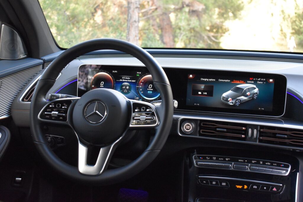 Αν και το εσωτερικό της οικογένειας EQ αλλά και πολλών νέων μοντέλων της, συμπεριλαμβανομένης της ανανεωμένης GLS, έχει πάρει το δρόμο της κάθετης κεντρικής διάταξης με ακόμα μεγαλύτερες οθόνες, το παλαιότερο set-up παραμένει σύγχρονο και digital. Στην EQC συναντούμε μια μίξη στοιχείων από διάφορα μοντέλα, με οδηγοκεντρική αίσθηση και τεχνολογικό χαρακτήρα. Ως αμιγώς ηλεκτρικό υπάρχουν στοιχεία που ξεχωρίζουν τόσο σε φυσική όσο και ψηφιακή μορφή. Αρχικά, το κουμπί με τη πρίζα στη κεντρική κονσόλα το οποίο εμφανίζει τα “εξηλεκτρισμένα” μενού στην οθόνη του infotainment. Εκεί βρίσκονται όλα τα απαραίτητα όπως ο προγραμματισμός της φόρτισης, η εύρεση φορτιστών, οι αναλυτικές καταναλώσεις ενέργειας και το διάγραμμα ροής ισχύος και φόρτισης. Το σύστημα πλοήγησης συμπεριλαμβάνει επίσης τις απαραίτητες στάσεις για φόρτιση σε ταξίδι ή μεγάλες αποστάσεις ενώ υπολογίζει και την υπολειπόμενη αυτονομία που θα έχει κατά την άφιξη στον τελικό προορισμό.