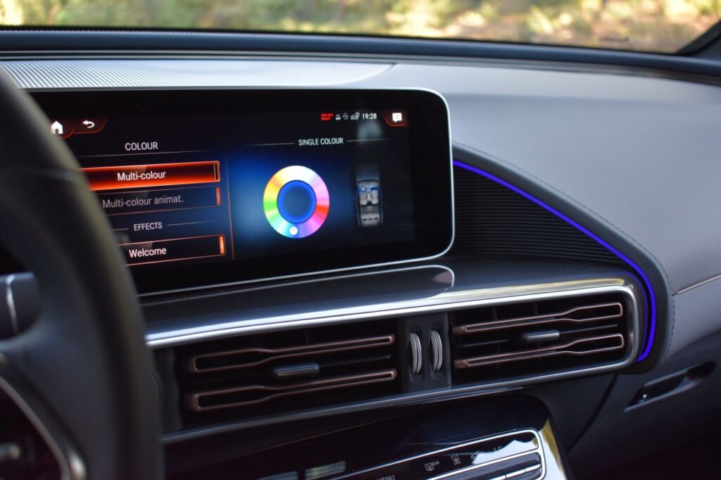 Την παράσταση στο εσωτερικό κλέβει ο ατμοσφαιρικός φωτισμός με τις πολλές χρωματικές επιλογές και τις θεματικές επιλογές διχρωμίας. Το βράδυ χαρίζει μια ανεπανάληπτη εμπειρία χαλάρωσης στους επιβάτες, την οποία προϊδεάζει το φωτιζόμενο λογότυπο EQC στα μαρσπιέ. Το ηχοσύστημα της Burmester με 13 ηχεία και 590 watt είναι το καλύτερο που έχουμε ακούσει σε αυτοκίνητο που κυκλοφορεί στην ελληνική αγορά, με κρυστάλλινο ήχο που απλά απογειώνει ακόμα και τη μουσική από τους ραδιοφωνικούς σταθμούς.