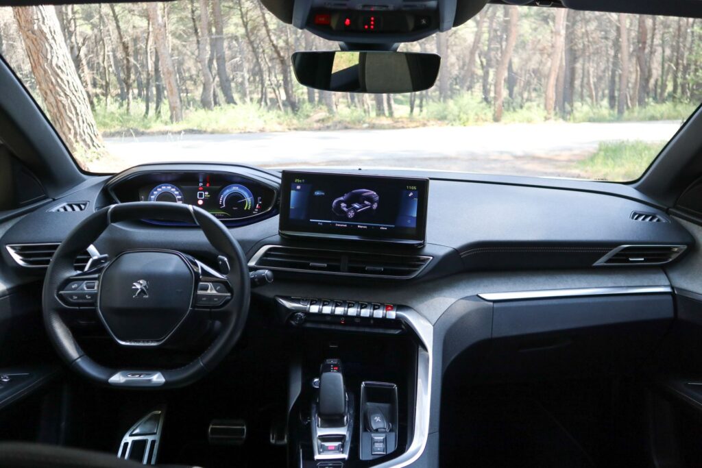 Στο εσωτερικό την παράσταση κλέβει το i-Cockpit, ένα τρίπτυχο που περιλαμβάνει δύο οθόνες και το τιμόνι. Η διάταξη αυτή έγινε σήμα κατατεθέν για την Peugeot και καμία άλλη εταιρεία δεν χρησιμοποιεί κάτι ανάλογο. Το τιμόνι είναι μικρό, ο ψηφιακός πίνακας οργάνων ψηλά και η κεντρική οθόνη στραμμένη προς τον οδηγό. Γενικότερα όλο το ταμπλό έχει μια κλίση προς αυτόν και η κεντρική κονσόλα είναι αρκετά ψηλά διαχωρίζοντας τον από τον συνοδηγό και δημιουργώντας μια αίσθηση αρκετά οδηγοκεντρική.