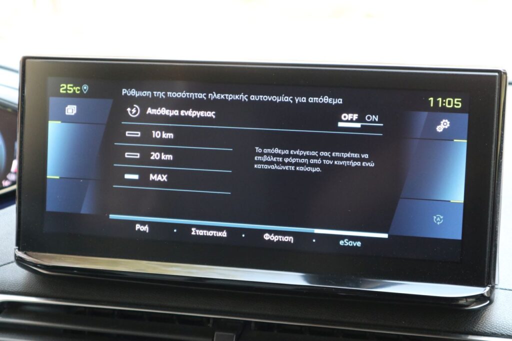 Το ίδιο γραφικό βρίσκεται επίσης στην κεντρική οθόνη 10″ σε ένα ειδικό μενού για τις Plug-in υβριδικές εκδόσεις που περιλαμβάνει στατιστικά κατανάλωσης ενέργειας , στοιχεία για τη φόρτιση και την ενεργοποίηση της εν κινήσει φόρτισης ή της διατήρησης του ποσοστού της μπαταρίας. Αυτά τα μενού εμφανίζονται με το πάτημα ενός νέου κουμπιού με σήμα έναν “κεραυνό” δίπλα στη χαρακτηριστική σειρά κουμπιών-συντομεύσεων σε στυλ πιάνο. Εκτός από αυτό το κουμπί υπάρχει και ένα για τον προγραμματισμό του κλιματισμού στο ταμπλό, στα αριστερά του τιμονιού μαζί με ένα για το ξεκλείδωμα της τάπας ανεφοδιασμού καυσίμου, όπως συνηθίζεται στα μοντέλα που συνδυάζουν θερμικό και ηλεκτρικό κινητήρα.