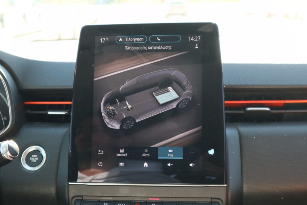 Στην κεντρική οθόνης αφής που στη προκειμένη περίπτωση με το προαιρετικό πακέτο εξοπλισμού PACK Navi έχει διαγώνιο 9,3 ίντσες, διαθέσιμα είναι τόσο ένα γραφικό της ροής του συστήματος όσο αναλυτικές πληροφορίες για τη κατανάλωση καυσίμου/ενέργειας αλλά και τη διανυθείσα απόσταση με καύσιμο ή ρεύμα αντίστοιχα.