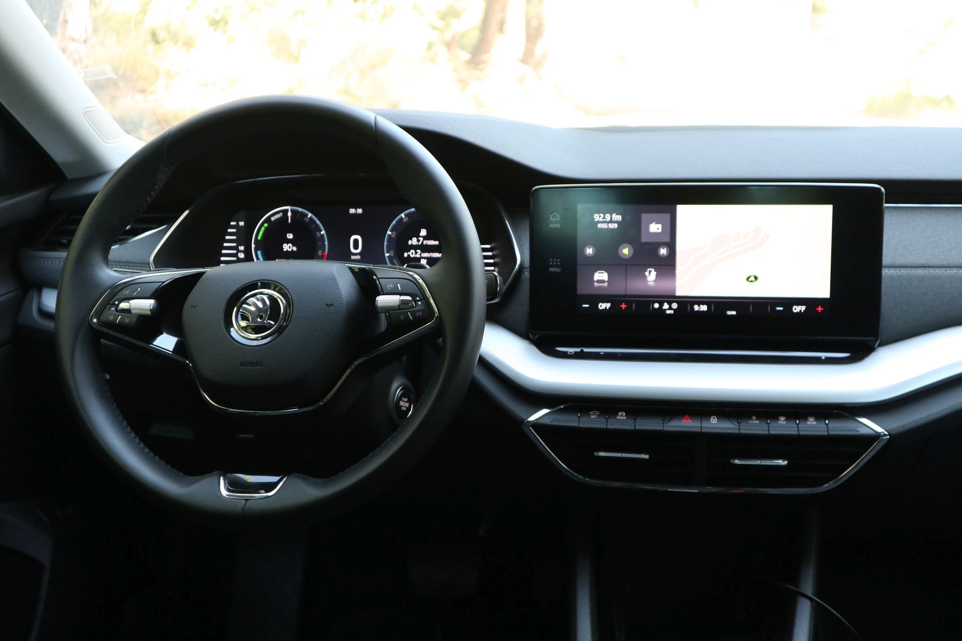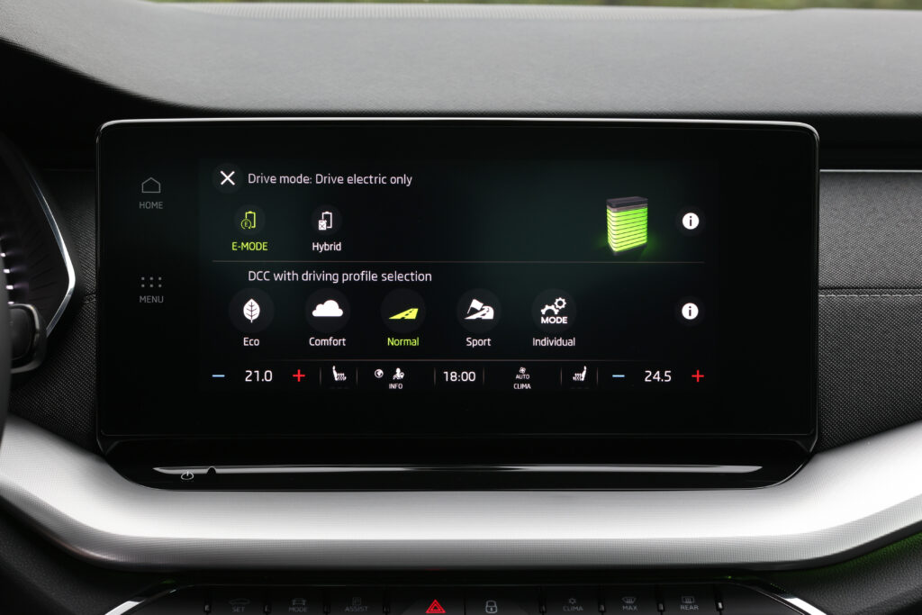 Στο εσωτερικό πάντως οι διαφορές είναι μεγαλύτερες από τις υπόλοιπες εκδόσεις της. Ο ψηφιακός πίνακας οργάνων 10 ιντσών είναι στάνταρ στο Plug-In υβριδικό σύνολο και διαθέτει νέες ενδείξεις ενσωματωμένες στα μινιμαλιστικά γραφικά του για τη φόρτιση, τη κατάσταση της μπαταρίας και τη χρήση της ενέργειας. Το ίδιο συμβαίνει και στην 10ίντση οθόνη του infotainment που εκτός από όλα τα παραπάνω έχει επιπλέον την επιλογή για το προγραμματισμό της φόρτισης και του κλιματισμού. Αυτές οι λειτουργίες μεταξύ άλλων μπορούν να γίνουν και απομακρυσμένα με την εφαρμογή MySkoda αλλά και μέσω φωνητικών εντολών από την ψηφιακή βοηθό που ακούει στο όνομα “Laura” και είναι ικανή να εκτελέσει αρκετές εντολές. Το σύστημα βασίζεται στο νεότερο λογισμικό του Group με το θέμα της Skoda και μια κεντρική οθόνη με μεγάλα παραμετροποιήσιμα widgets, τις συντομεύσεις για το κλιματιστικό (ελέγχεται και ρυθμίζεται μέσω της οθόνης αλλά υπάρχουν κανονικά κουμπιά για το ξεθάμπωμα) και κάποιες πληροφορίες, όμως για τα επιπλέον μενού και τις ρυθμίσεις θα χρειαστεί ορισμένος χρόνος εκμάθησης.
