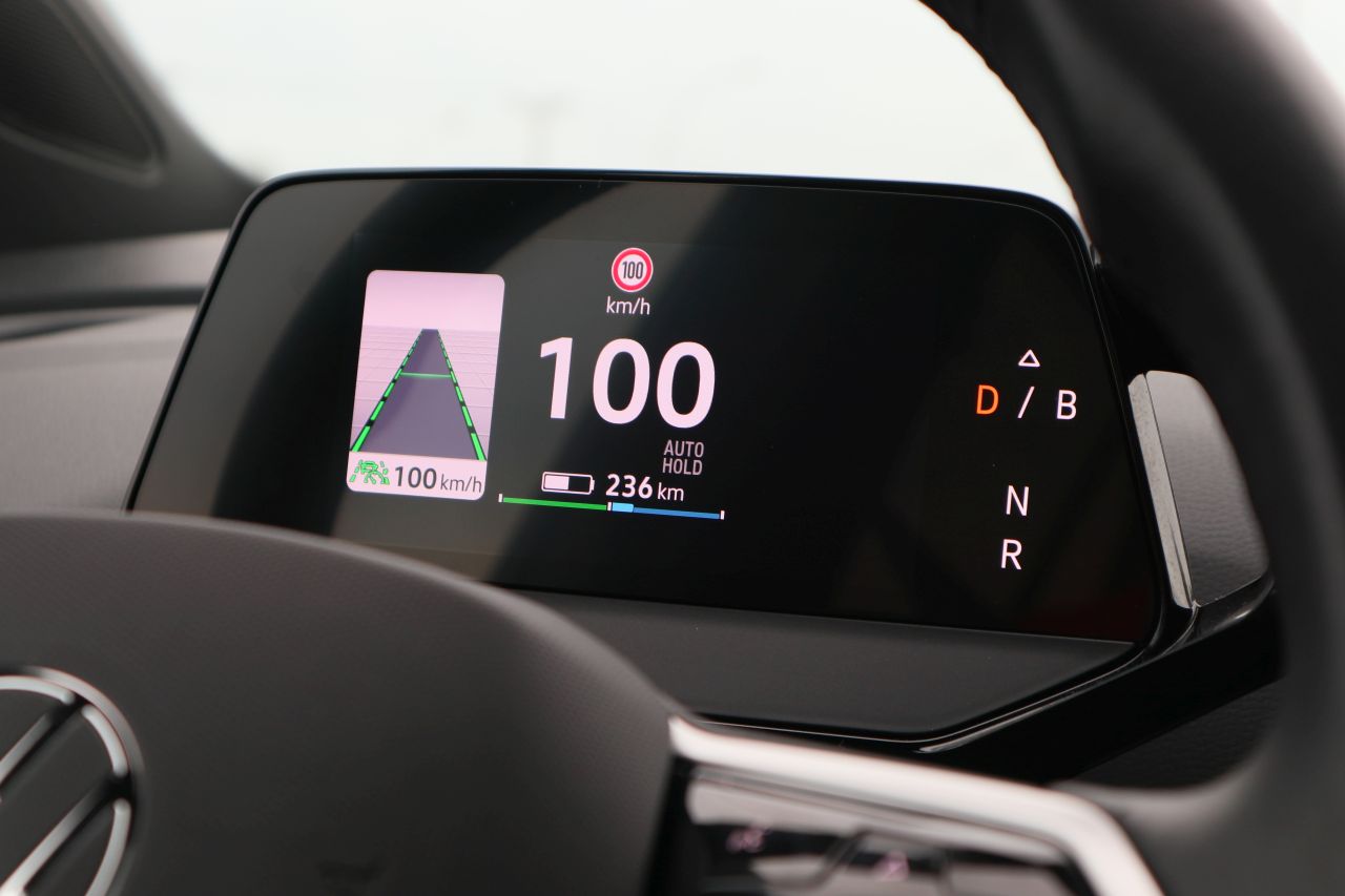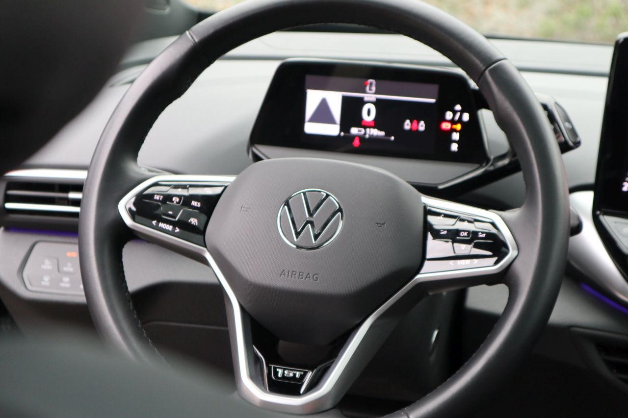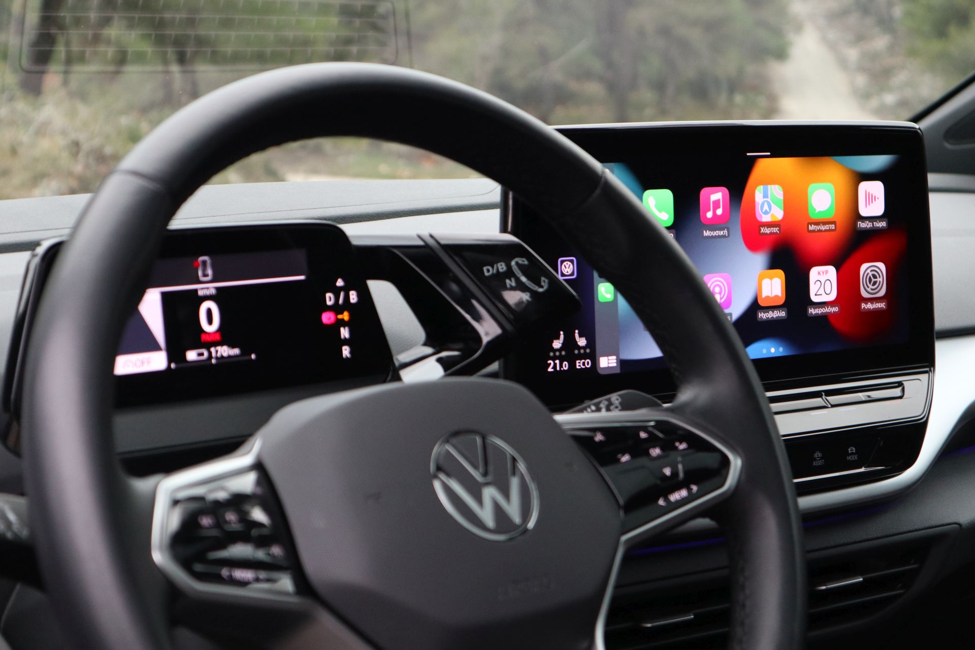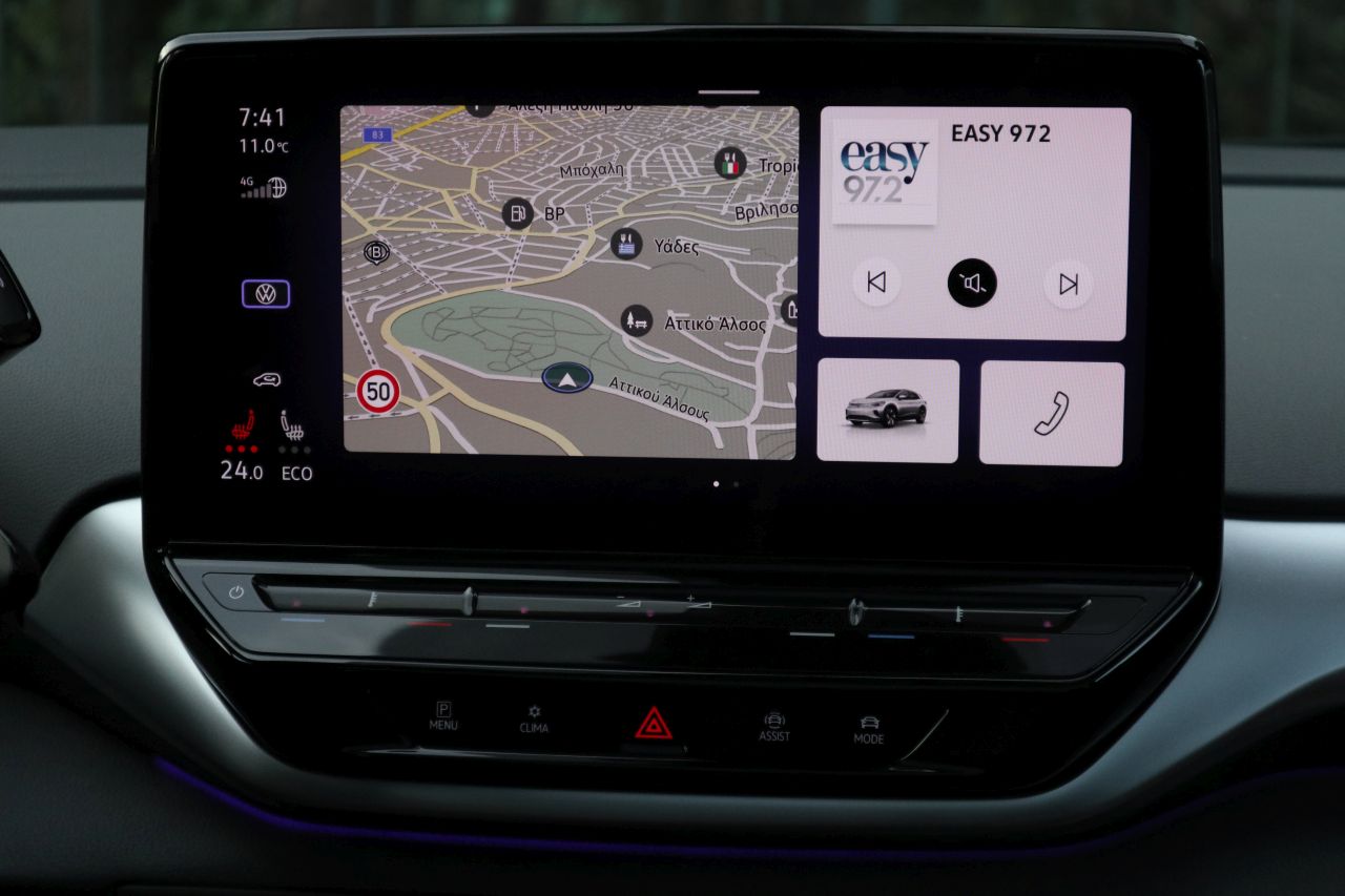 Τεχνολογικά το ID.4 συνεχίζει στο δρόμο που χάραξε η 8η γενιά Golf με το λεγόμενο “ψηφιακό” εσωτερικό και τις προσθήκες που έφερε η οικογένεια ID.. Μπροστά από τον οδηγό βρίσκεται ένας μικρός πίνακας οργάνων με διάμετρο μόλις 5,3 ίντσες, χωρίς καμία δυνατότητα παραμετροποίησης αλλά με όλες τις απαραίτητες πληροφορίες για την χρήση ενέργειας, την αυτονομία και το Travel Assist (Ημιαυτόνομη οδήγηση επιπέδου 2). Περισσότερες πληροφορίες είναι κρυμμένες στην κεντρική οθόνη αφής που στη περίπτωση της κορυφαίας έκδοσης ή ως πακέτο προαιρετικού εξοπλισμού, είναι 12 ιντσών αντί για 10. Το λογισμικό σύστημα της Volkswagen είχε δεχθεί ενημερώσεις από τη προηγούμενη φορά που το είχαμε χρησιμοποιήσει στο ID.3 και η εμπειρία χρήσης ήταν πιο ομαλή και πιο γρήγορη. Χωρίς να έχουμε κανένα απολύτως παράπονο από τις πολλές πληροφορίες και λειτουργίες που διαθέτει όπως π.χ. το ποσοστό της μπαταρίας και τις επιλογές φόρτισης, το προγραμματισμό του κλιματισμού, τις ρυθμίσεις με τα εντυπωσιακά γραφικά και τα μεγάλα εικονίδια, υπάρχουν πολλά υπομενού που θα χρειαστούν αρκετή εξοικείωση ώστε να πραγματοποιούνται ρυθμίσεις εν κινήσει. Ταυτόχρονα οι φωνητικές εντολές στα Ελληνικά συχνά-πυκνά δεν έχουν ανταπόκριση, κάτι που δεν ισχύει όταν η Αγγλική γλώσσα είναι επιλεγμένη αναγνωρίζοντας ακόμα και φράσεις. Σε κάθε περίπτωση η Volkswagen έχει δηλώσει ότι το σύστημα θα δέχεται συνεχώς ενημερώσεις και θα βελτιώνεται με τη πάροδο του χρόνου, προσθέτοντας χαρακτηριστικά, λειτουργίες, εφαρμογές και βελτιώνοντας ακόμα και την ενεργειακή απόδοση του αυτοκινήτου. Ο ατμοσφαιρικός φωτισμός με τις 30 χρωματικές επιλογές και συνδυασμούς χρωμάτων (10 στη βασική έκδοση) ήταν και είναι σημείο αναφοράς για αυτή τη ψηφιακή καμπίνα που προσαρμόζεται στη διάθεση του οδηγού ή την συμπεριφορά του αυτοκινήτου.