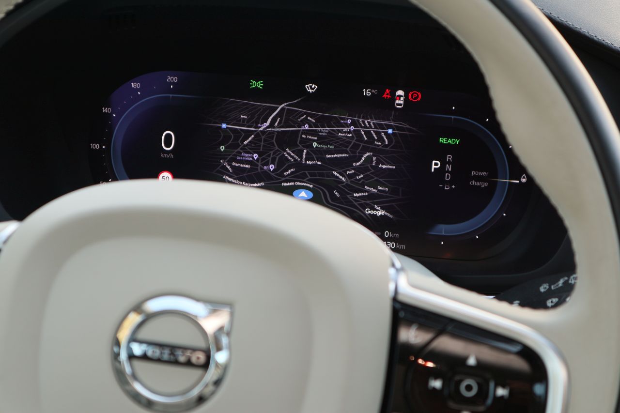 Η δεύτερη οθόνη που παίζει το ρόλο του πίνακα οργάνων είναι επίσης ανανεωμένη με καλύτερη ανάλυση και τα γραφικά που για πρώτη φορά είδαμε στα ηλεκτρικά XC40 και C40, με την καμπυλότητα στο πλάι και τον χάρτη της Google στη μέση. Δεν ξεχειλίζει από πληροφορία αλλά έχει όλα τα απαραίτητα και μπορεί να διαμορφωθεί σε 3 διαφορετικές προβολές.
