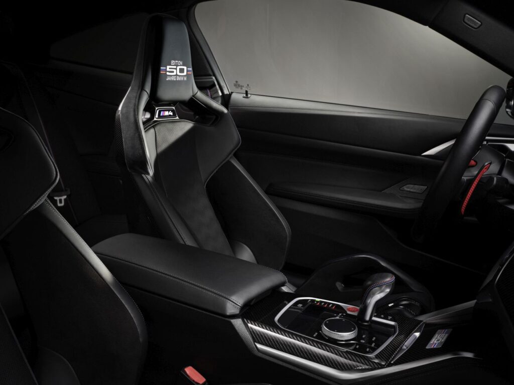 Στο εσωτερικό όλων των ειδικών εκδόσεων που βασίζονται στην BMW M4 Coupe, η επέτειος επισημαίνεται με στοιχεία όπως τα μαρσπιέ που φέρουν την επιγραφή “Edition 50 Jahre BMW M”, μία μεταλλική πλακέτα στην κεντρική κονσόλα με την επιγραφή “M4 Edition 50 Jahre BMW M” και ένα αντίστοιχο λογότυπο στα προσκέφαλα των στάνταρ σπορ καθισμάτων M και των προαιρετικών, ανθρακονημάτινων μπάκετ καθισμάτων M για τον οδηγό και τον συνοδηγό.