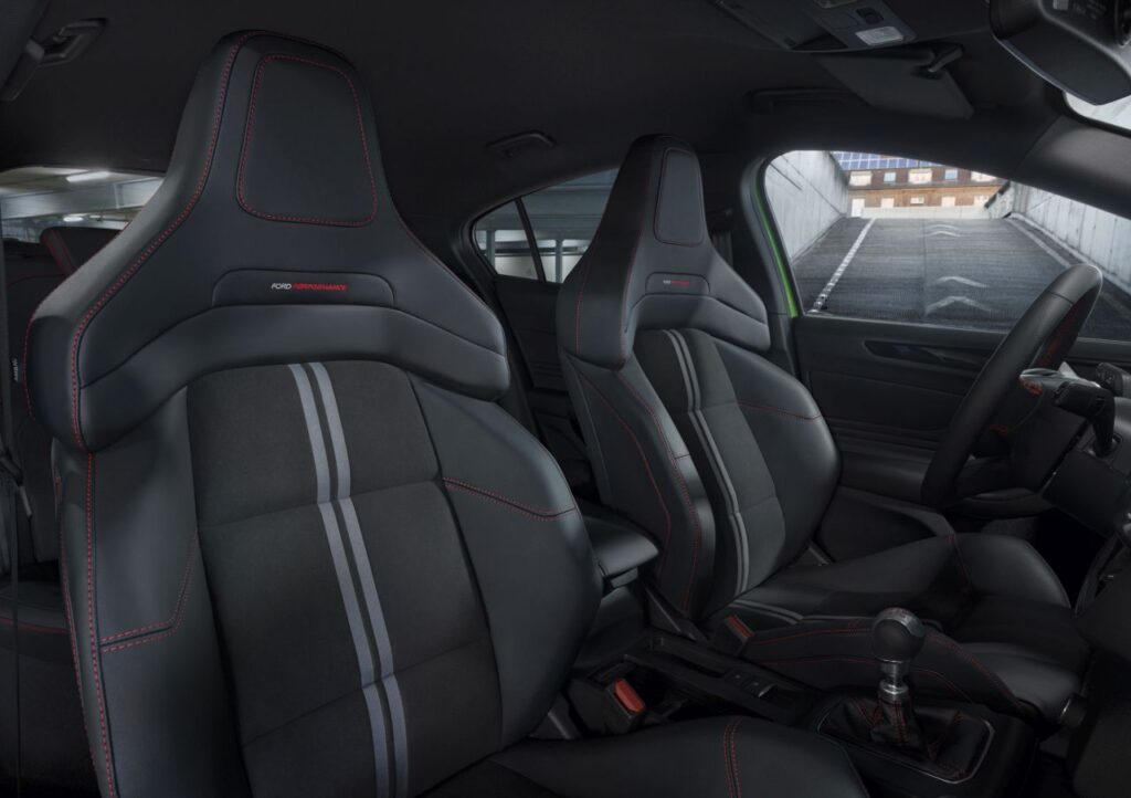 Στο εσωτερικό, εξοπλίζεται με τα νέα καθίσματα Performance Seats, που εξελίχθηκαν από τους μηχανικούς της Ford Performance ώστε να παρέχουν υψηλά επίπεδα στήριξης τόσο στην πίστα όσο και στις καθημερινές μετακινήσεις. Τα καθίσματα έχουν επίσης πιστοποίηση από τον οργανισμό για υγιή πλάτη Aktion Gesunder Rücken e.V. (AGR). Η ηλεκτρική ρύθμιση 14 κατευθύνσεων, συμπεριλαμβανομένης της οσφυϊκής στήριξης τεσσάρων κατευθύνσεων, βοηθά τους οδηγούς να βρουν την ιδανική θέση, ενώ η στάνταρ λειτουργία θέρμανσης συνεισφέρει στα υψηλά επίπεδα άνεσης.