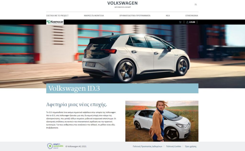 Τα διαθέσιμα προς αγορά ηλεκτρικά οχήματα από το Volkswagen Group και την Kosmocar είναι τα Volkswagen e-up!, ID.3, ID.4 (στο προσεχές μέλλον θα προστεθεί και το ηλεκτρικό scooter SEAT MÓ 125 eScooter), με τις δύο εταιρείες να προσφέρουν συνδυαστικά σημαντικές επιδοτήσεις για την αγορά τους, που φτάνουν έως τα 7.750 €. Στην ήδη προνομιακή αυτή τιμή, η Ελληνική Δημοκρατία υποστηρίζει από την πλευρά της την αγορά ηλεκτρικού οχήματος από τους κατοίκους και τις επιχειρήσεις του νησιού με ειδική επιπλέον επιδότηση, που για ένα ηλεκτρικό αυτοκίνητο αντιστοιχεί στο 40% της Λιανικής Τιμής Προ Φόρων (για λιανική τιμή έως 50.000 €), με μέγιστο ποσό επιδότησης τα 12.000 €. Επιπλέον αυτής, οι δικαιούχοι μπορούν να λάβουν πρόσθετη επιδότηση 3.000 €, για την απόσυρση του παλιού τους οχήματος, ενώ στη διάθεσή τους προς αγορά είναι φορτιστές οικιακής χρήσης, οι οποίοι επιδοτούνται με το ποσό των 500 €.