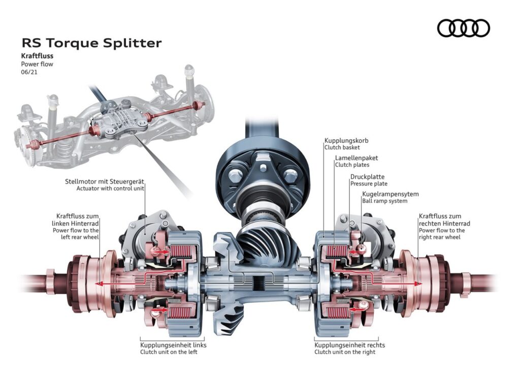 Το RS Torque Splitter καθιστά δυνατό τον ενεργό, πλήρως μεταβλητό διαμοιρασμό ροπής μεταξύ των πίσω τροχών. Σε αντίθεση με το διαφορικό του πίσω άξονα και το προηγούμενο πακέτο πολύδισκου συμπλέκτη, ο κατανεμητής ροπής χρησιμοποιεί από έναν ηλεκτρονικά ελεγχόμενο πολύδισκο συμπλέκτη σε κάθε ημιαξόνιο. Κατά τη δυναμική οδήγηση, ο κατανεμητής ροπής αυξάνει τη ροπή κίνησης στον εξωτερικό πίσω τροχό με το υψηλότερο φορτίο, γεγονός που μειώνει σημαντικά την τάση υποστροφής. Στις αριστερόστροφες καμπύλες, μεταδίδει τη ροπή στον δεξιό πίσω τροχό, στις δεξιόστροφες καμπύλες στον αριστερό πίσω τροχό και στην ευθεία και στους δύο τροχούς. Αυτό έχει ως αποτέλεσμα τη βέλτιστη σταθερότητα και τη μέγιστη ευελιξία – ειδικά σε στροφές με υψηλές ταχύτητες. Κατά την οδήγηση σε κλειστούς δρόμους, ο κατανεμητής ροπής επιτρέπει ελεγχόμενες κινήσεις εφαρμόζοντας όλη την ισχύ του κινητήρα σε έναν μόνο από τους πίσω τροχούς – έως και 1.750 Nm ροπής. Η ακριβής κατανομή της ροπής κίνησης εξαρτάται πάντα από τη λειτουργία που επιλέγεται στο Audi drive select και την αντίστοιχη κατάσταση οδήγησης.